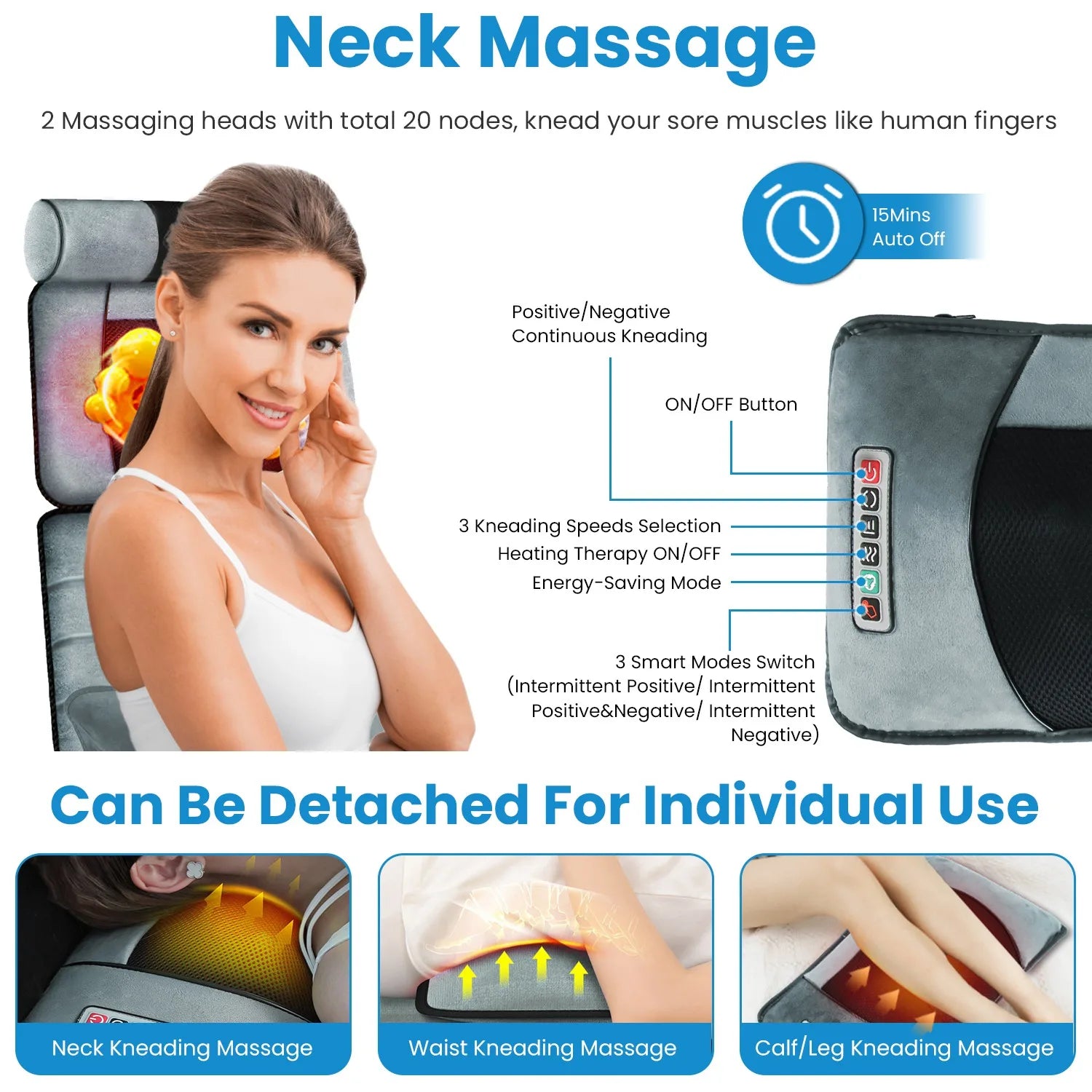 - Detachable neck massage with two kneading heads (20 nodes) plus a foot massage with 32 nodes and an inflatable lumbar pillow deliver tailored neck, foot, and lower-back relief for you, with multiple kneading patterns.