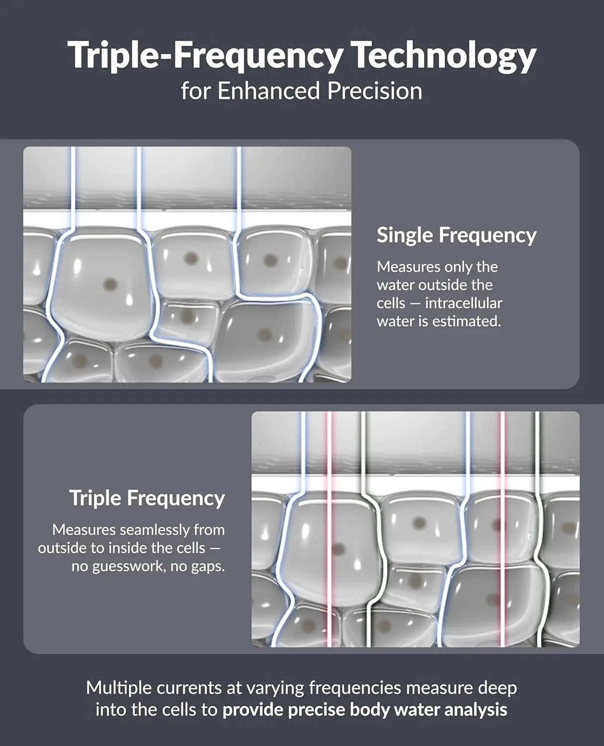 - Advanced triple-frequency BIA reads fat, muscle, and visceral health with precision, giving you actionable insights beyond a simple scale.