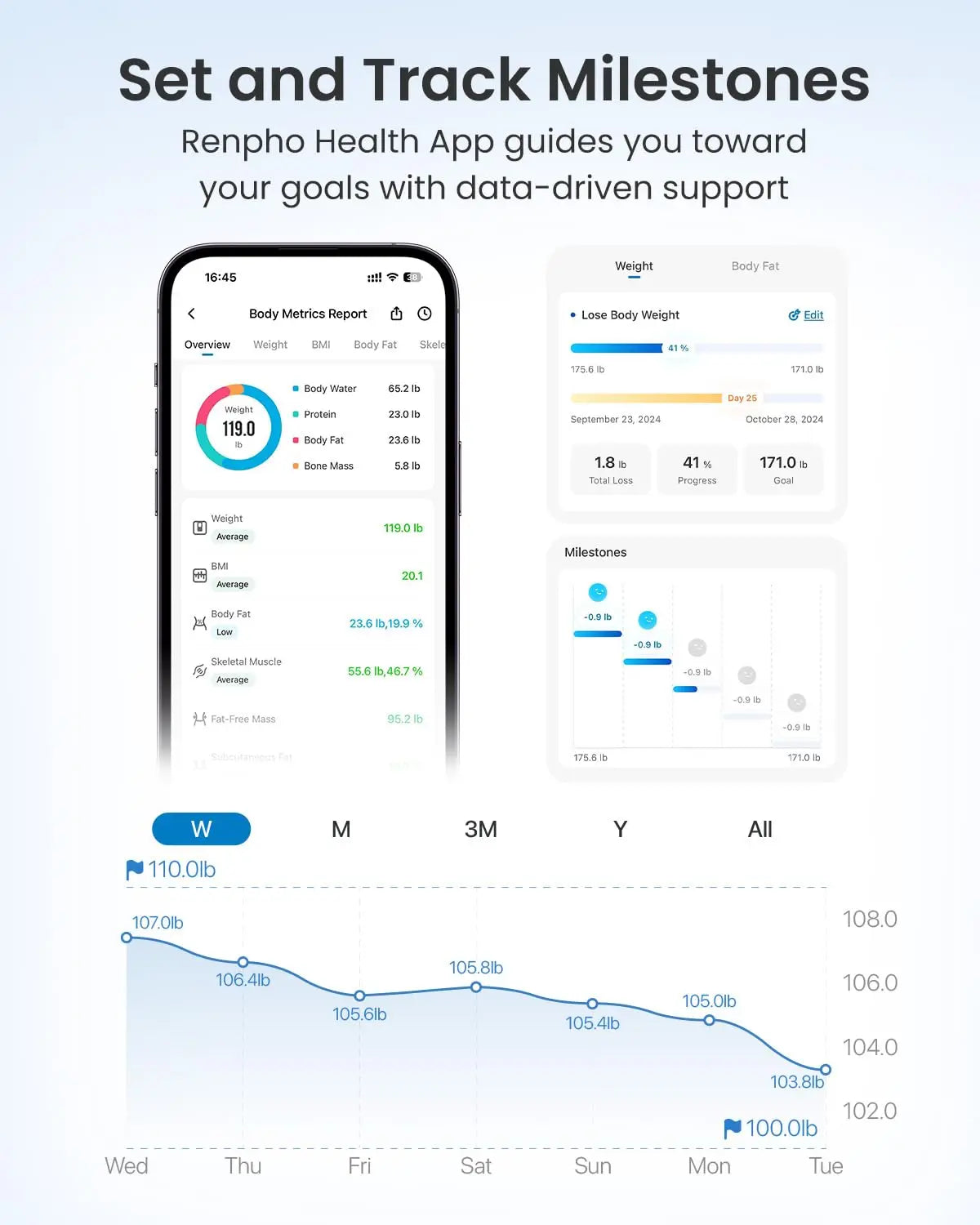 - Track 13 body composition metrics, including bone mass, water weight, and visceral fat, so you understand how your choices move the scale.